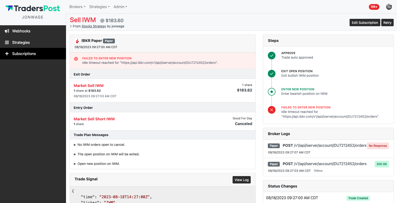 If you login to another IBKR client with the same username that TradersPost uses, it is possible it can cause automated trades to fail as the session may not be active and available when we go to execute the trade. We will make an attempt to start the session and wait for the session to become active before retrying the trade, but it is possible IBKR may be delayed in starting the session and the trade won't be able to be executed.