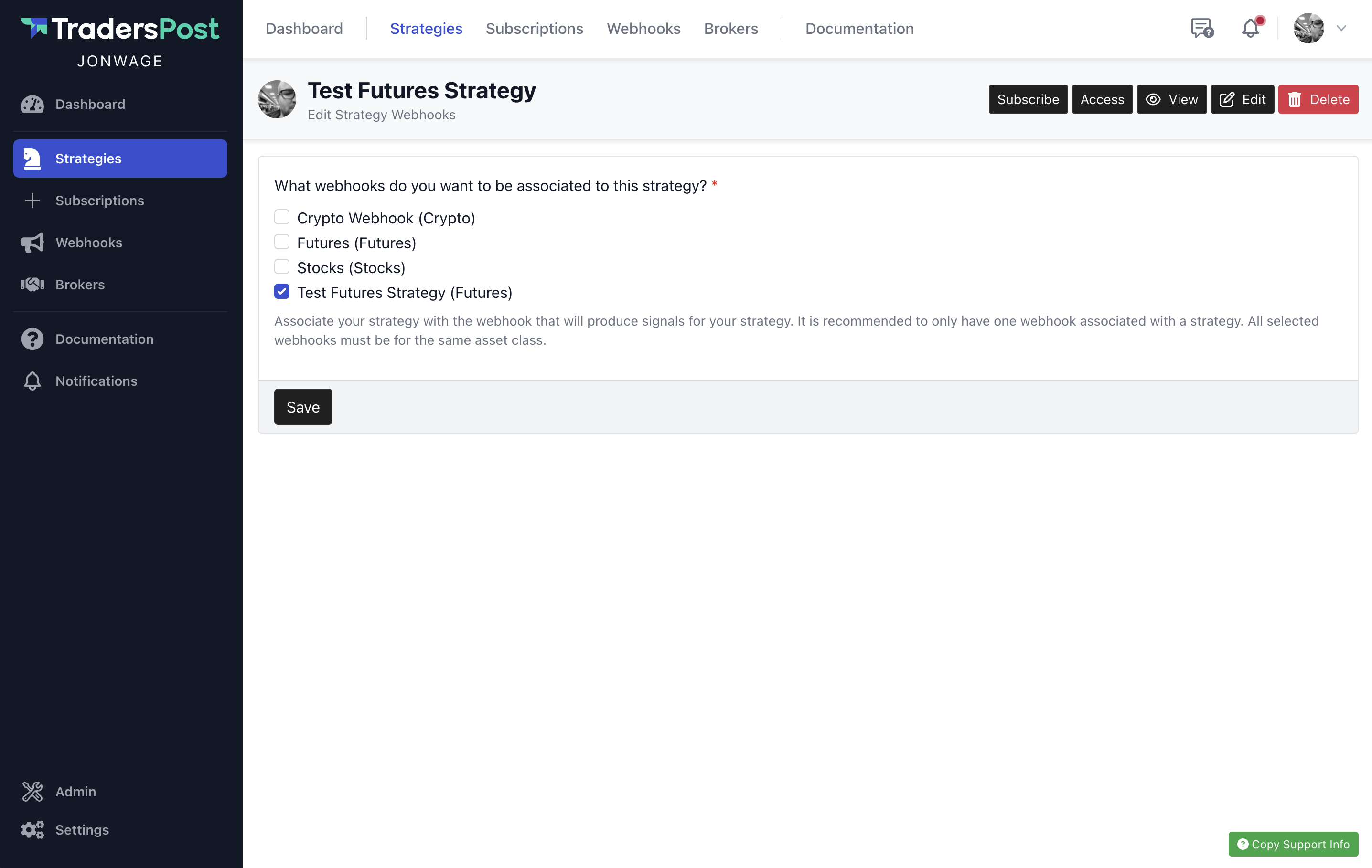 This has been simplified so that when you create a new strategy, it creates both the strategy and a webhook at the same time. If you want to change the webhook that powers a strategy in the future, you can create a new webhook and then migrate your strategy from one webhook to another by editing your strategy associated webhooks.